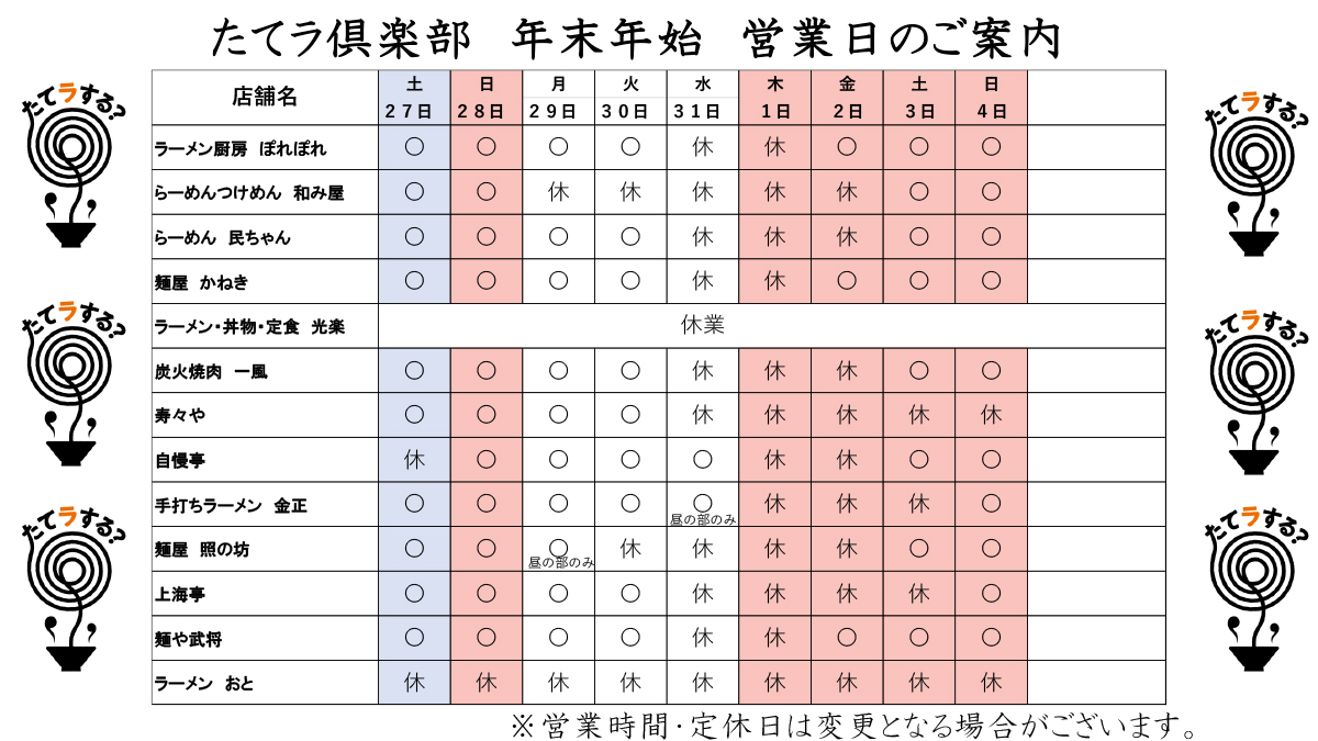 【たてラ倶楽部 年末年始の休業日案内】