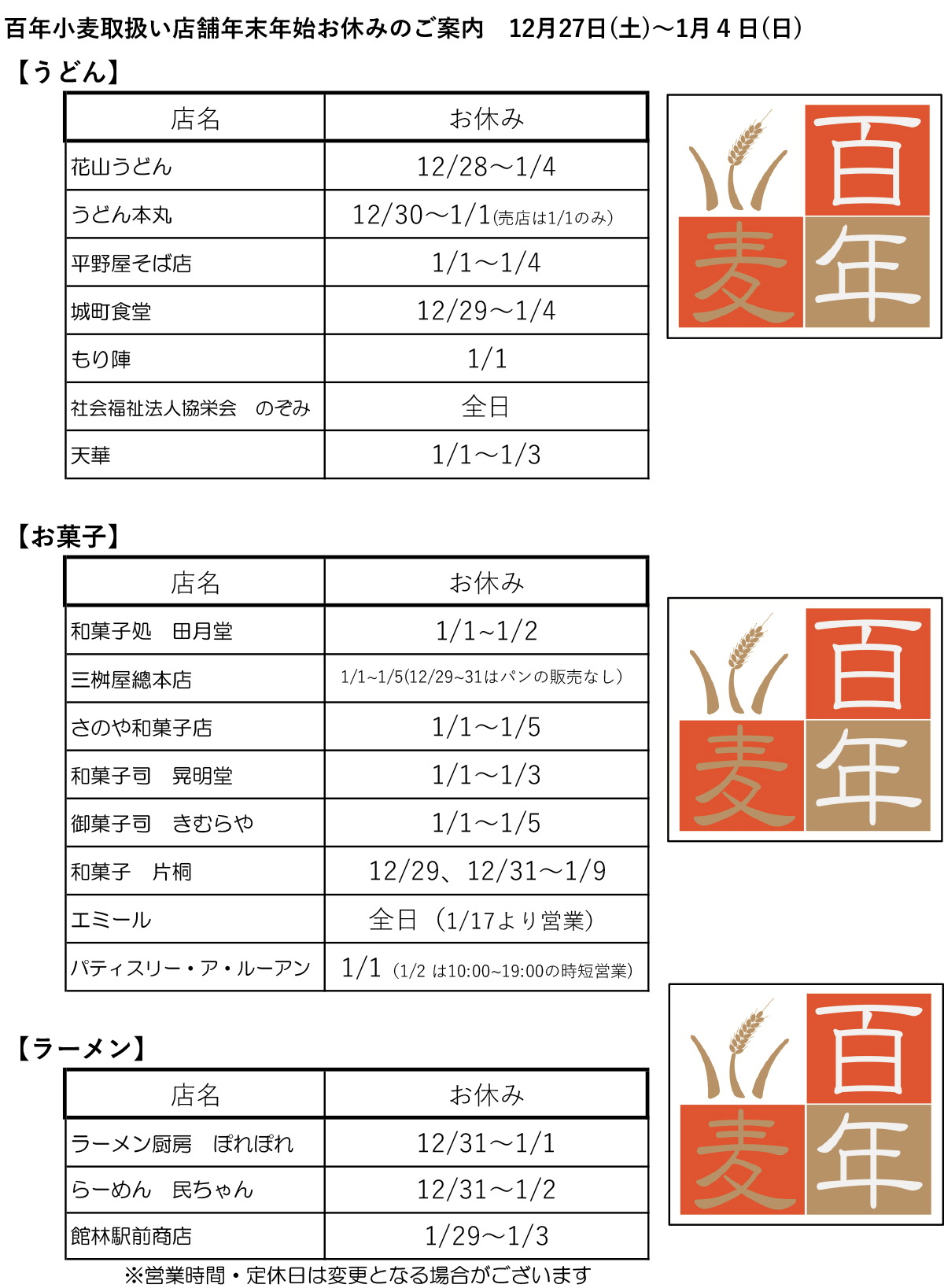 【百年小麦取扱店 年末年始の休業日案内】